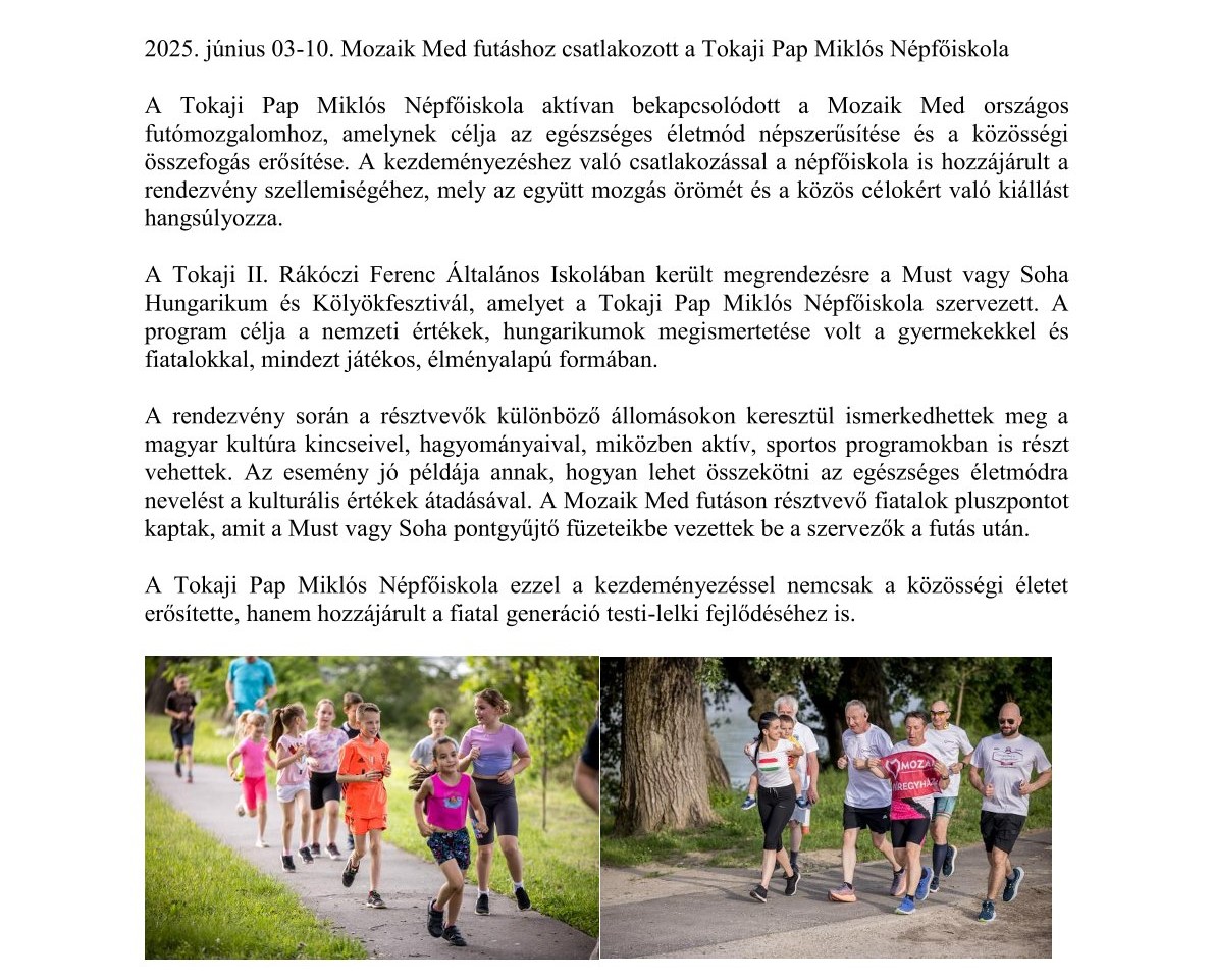 2025. június 03-10. Mozaik Med futáshoz csatlakozott a Tokaji Pap Miklós Népfőiskola