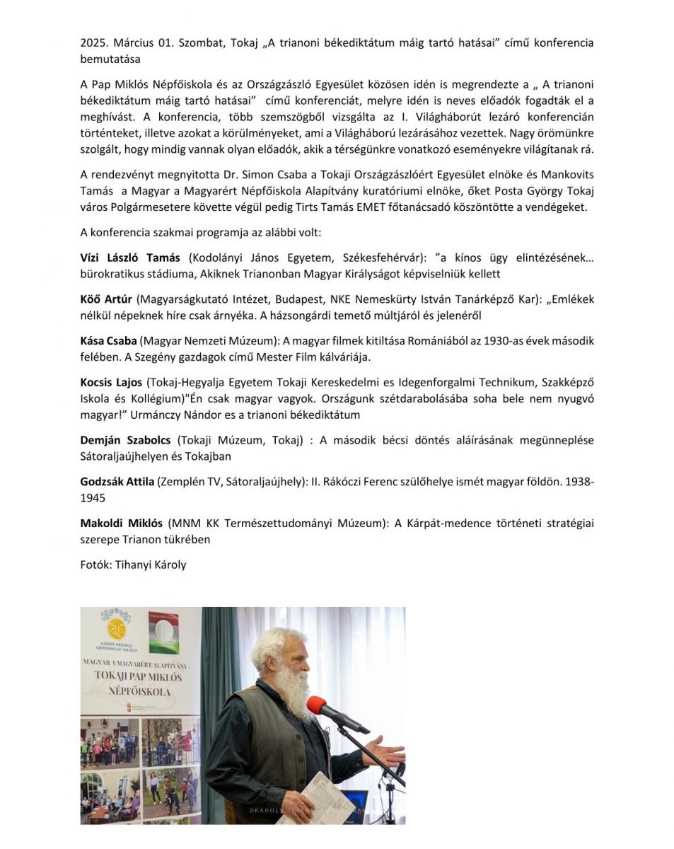 2025. Március 01. Szombat, Tokaj „A trianoni békediktátum máig tartó hatásai” című konferencia bemutatása