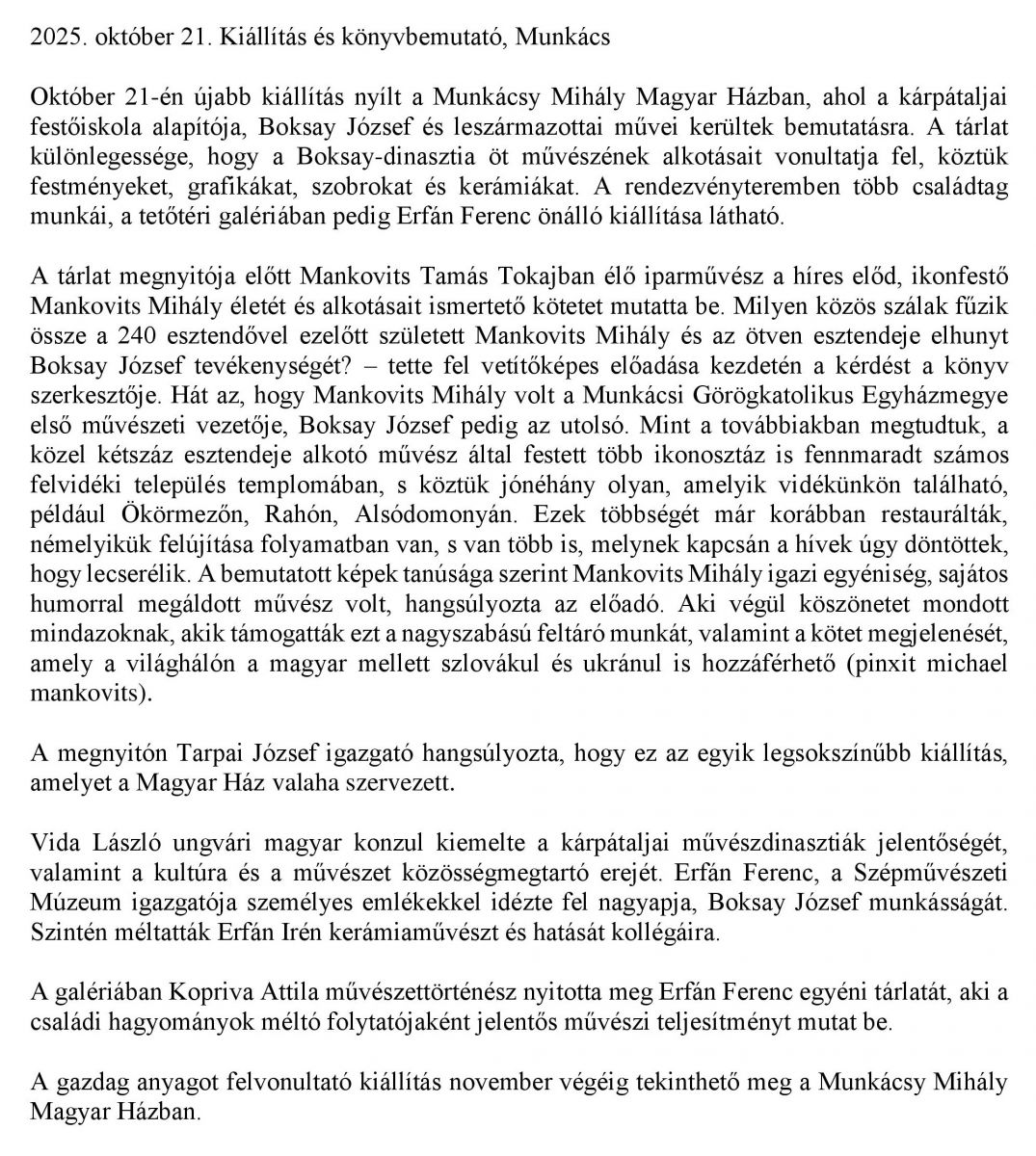 2025. október 21. Kiállítás és könyvbemutató, Munkács