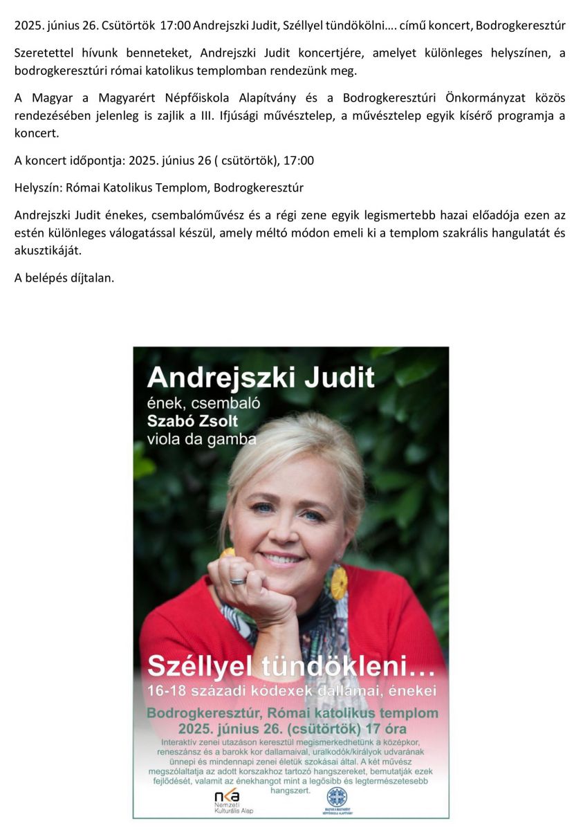 Andrejszki Judit, Széllyel tündökölni.... című koncert, Bodrogkeresztúr