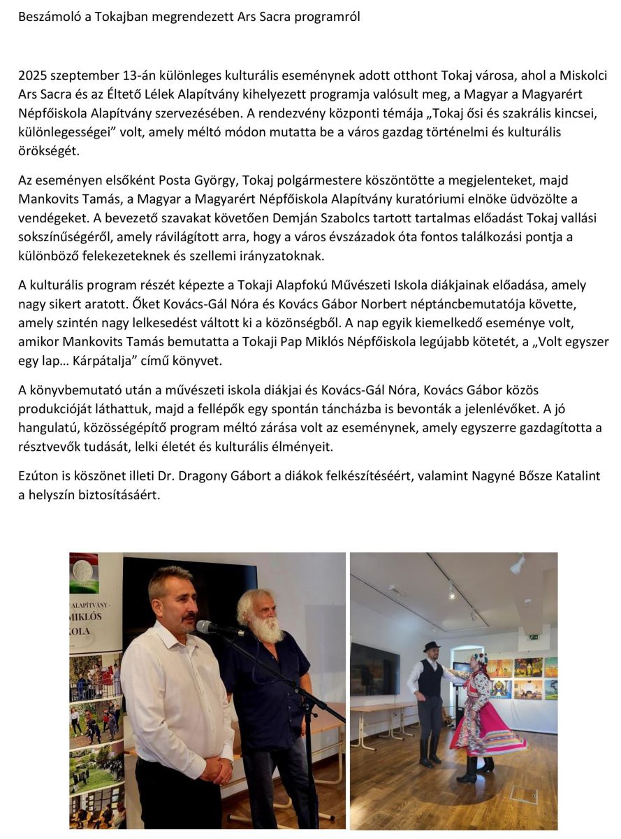 Beszámoló a Tokajban megrendezett Ars Sacra programról