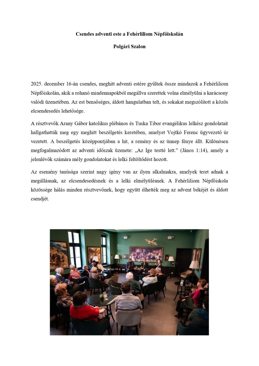 Csendes adventi este a Fehérliliom Népfőiskolán