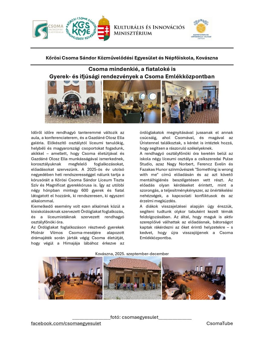 Csoma mindenkié, a fiataloké is Gyerek- és ifjúsági rendezvények a Csoma Emlékközpontban