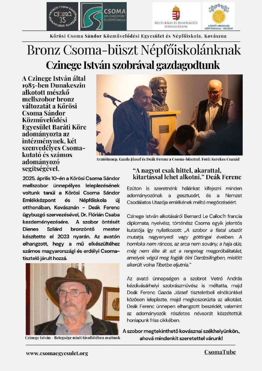 Czinege István szobrával gazdagodtunk: Bronz Csoma-büszt Népfőiskolánknak