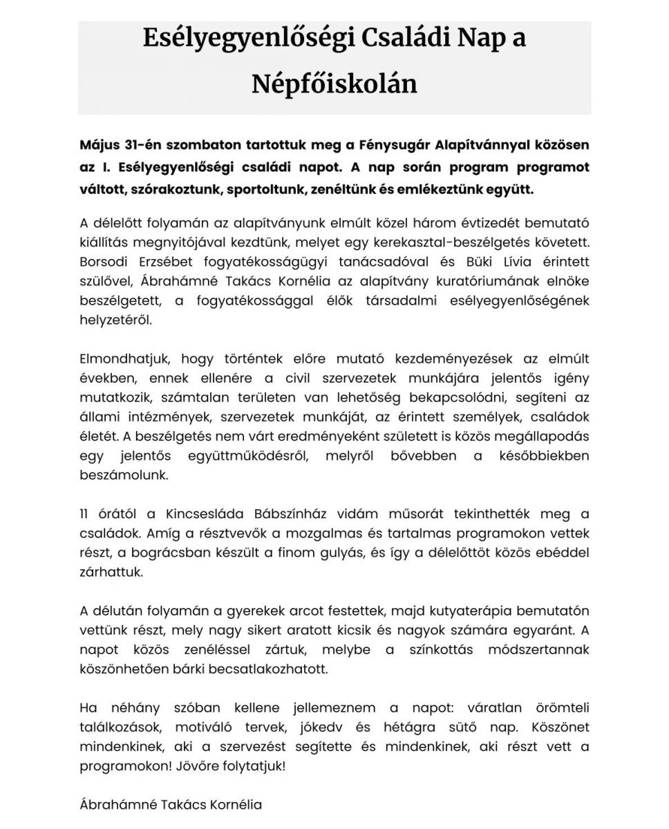 Esélyegyenlőségi Családi Nap a Népfőiskolán