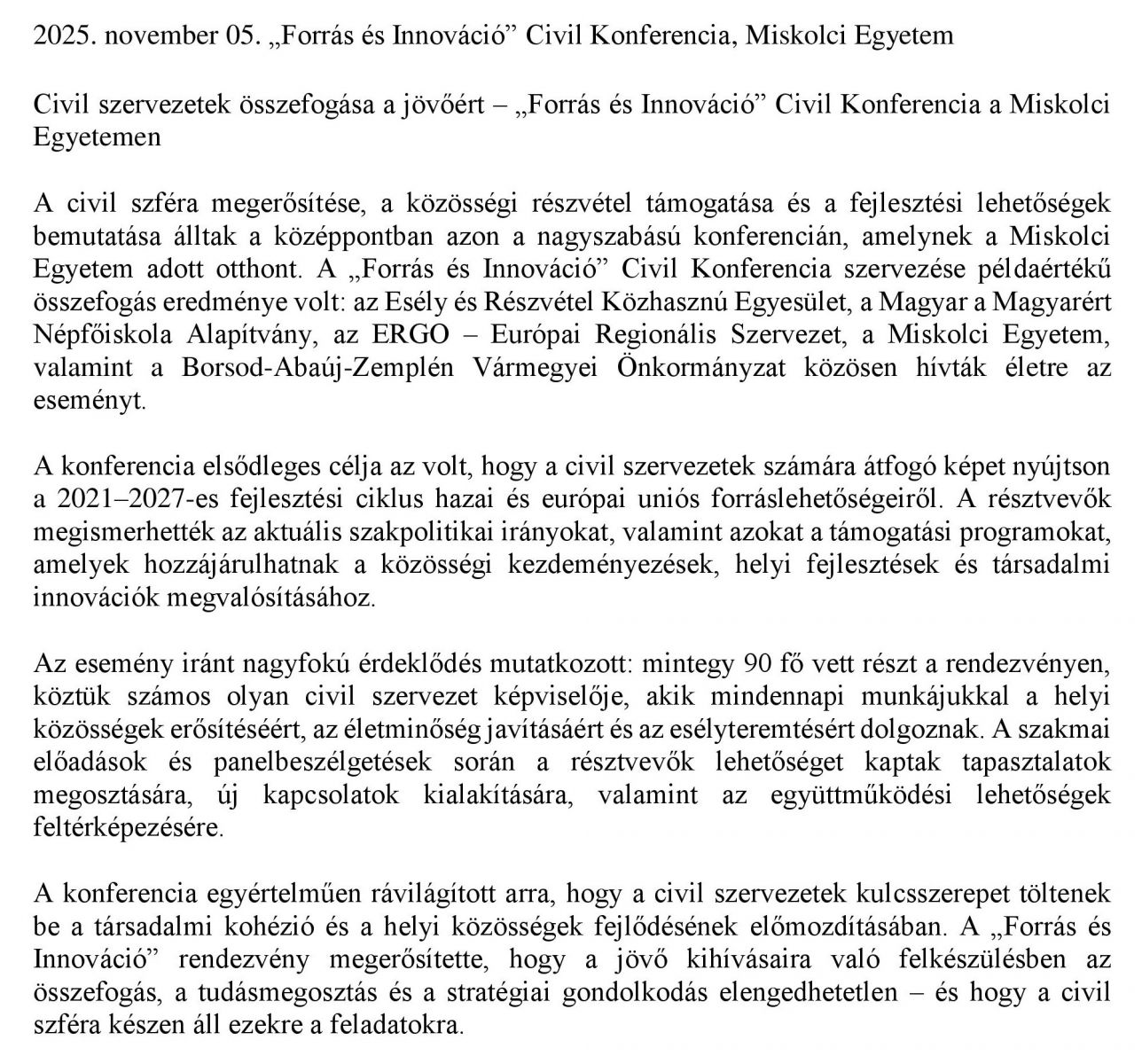 „Forrás és Innováció” Civil Konferencia, Miskolci Egyetem