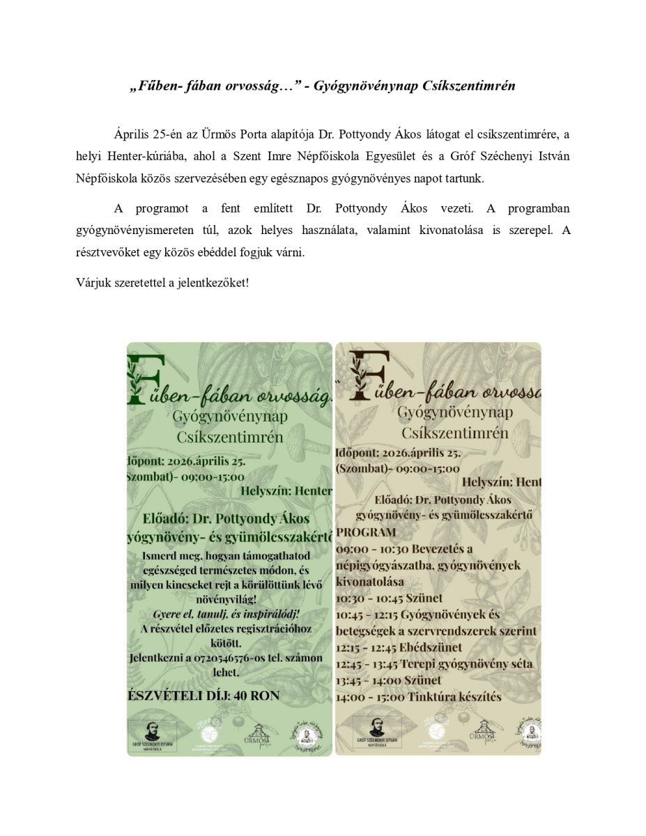 További információért látogassanak el az csíkszentimrei Szent Imre Népfőiskola Egyesület honlapjára.