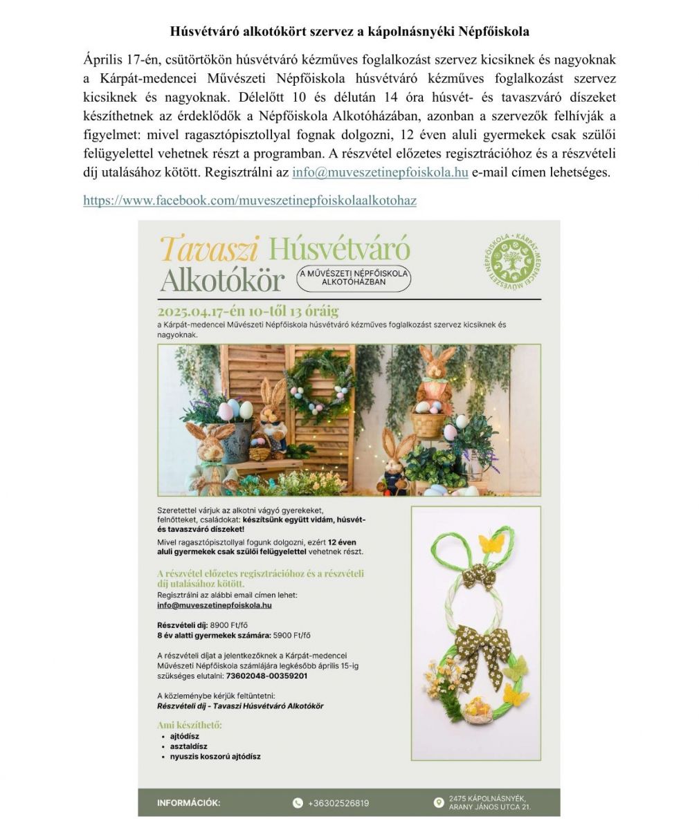 Húsvétváró alkotókört szervez a kápolnásnyéki Népfőiskola