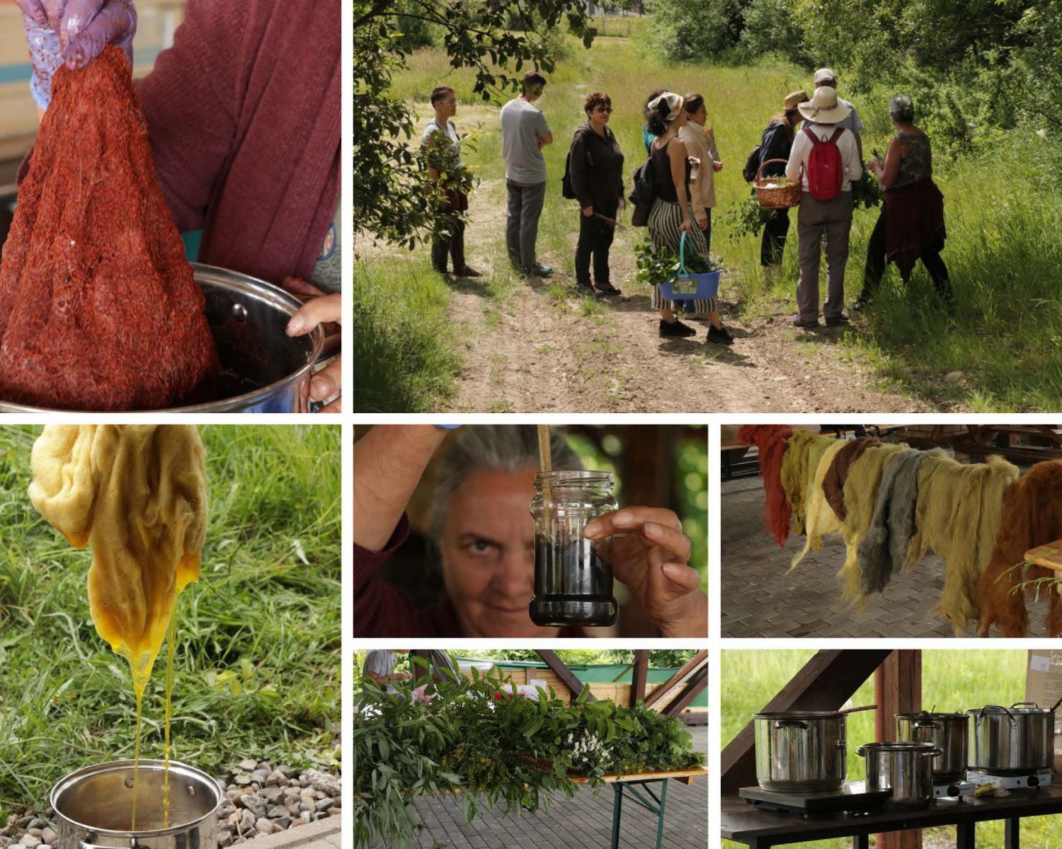Páll Etelka reggel már előre áztatott kérgekkel várt minket, felhelyeztük a tűzre őket és nekiindultunk a többi alapanyag beszerzésének. A páclé előkészítése, a gyapjú áztatása valamint a festék- és rögzítőanyagokkal való foglalatosság között információcsere, baráti beszélgetések, sok mosoly kapott helyet. Minden pácléből kiemelt-megfestett gyapjúköteg új és új meglepetéssel szolgált! A szürke, barna, vörös, zöld, sárga különböző árnyalatait nyertük ki a növényekből. Festettünk égerfával, vérehulló fecskefűvel, festőbuzérral, csalánnal, festőrekettyével és zöld diólevéllel is. Nem is gondolnánk, milyen gazdag a rét, a környezetünk, ami körülvesz minket!