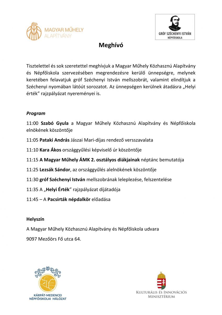Meghívó Széchenyi István mellszobrának felavató ünnepségére