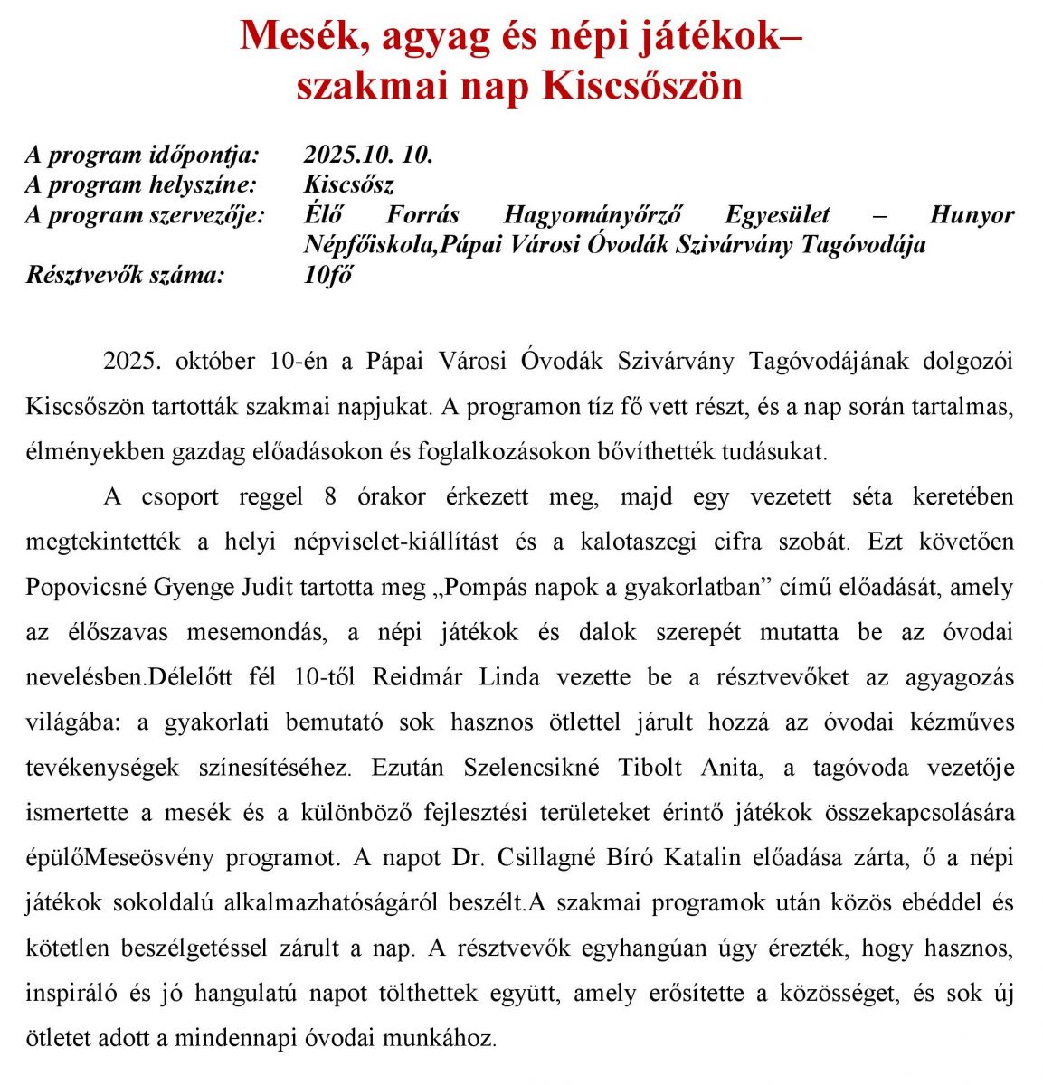Mesék, agyag és népi játékok– szakmai nap Kiscsőszön
