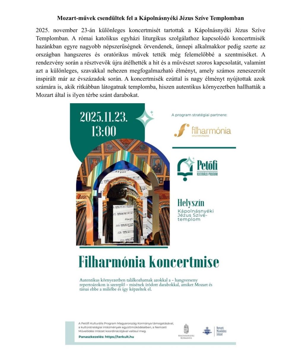 Mozart-művek csendültek fel a Kápolnásnyéki Jézus Szíve Templomban
