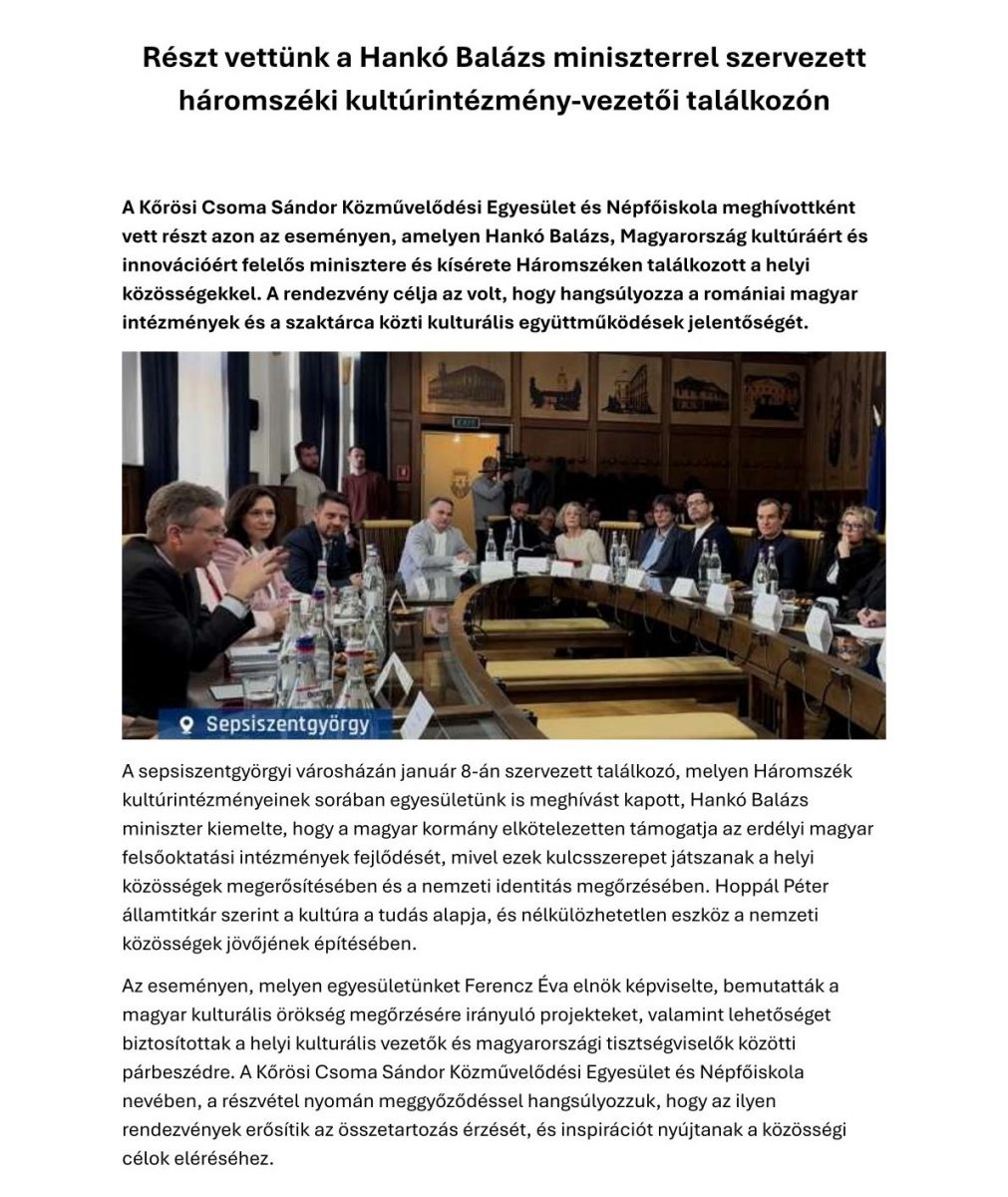A Kőrösi Csoma Sándor Közművelődési Egyesület és Népfőiskola meghívottként vett részt azon az eseményen, amelyen Hankó Balázs, Magyarország kultúráért és innovációért felelős minisztere és kísérete Háromszéken találkozott a helyi kulturális közösségekkel. A rendezvény célja az volt, hogy hangsúlyozza a romániai magyar intézmények és a szaktárca közti kulturális együttműködések jelentőségét.