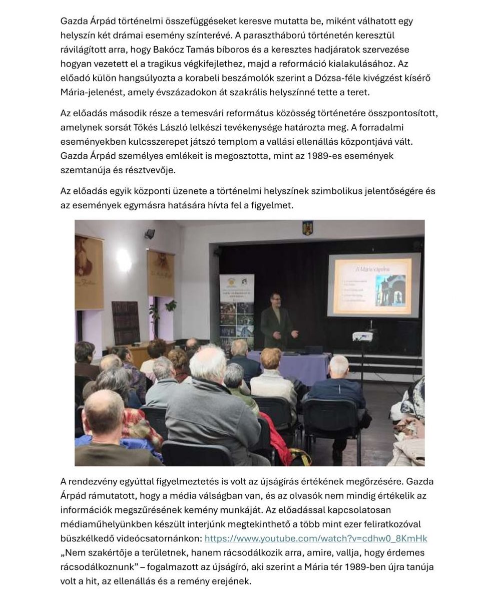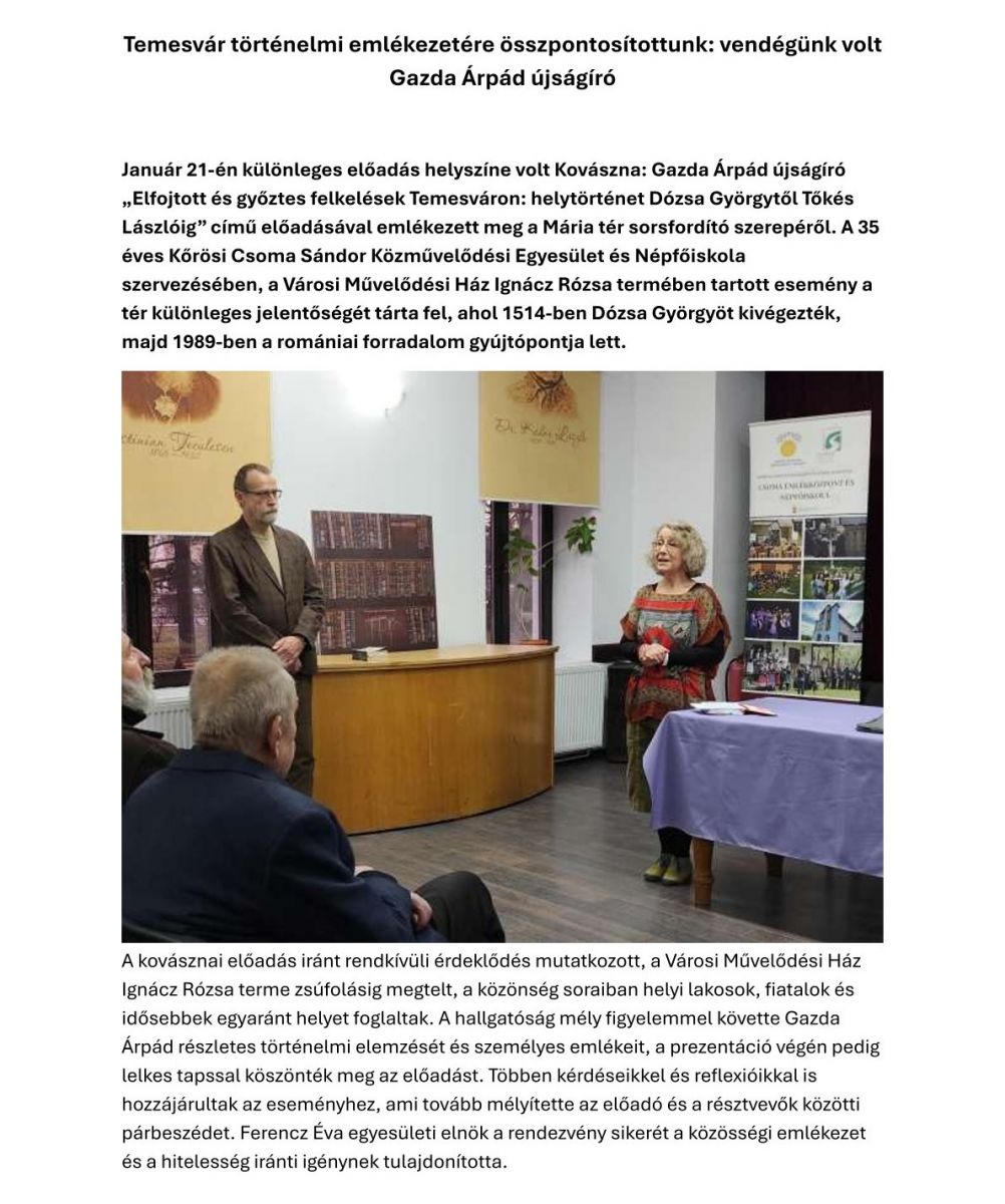 Január 21-én különleges előadás helyszíne volt Kovászna: Gazda Árpád újságíró „Elfojtott és győztes felkelések Temesváron: helytörténet Dózsa Györgytől Tőkés Lászlóig” című előadásával emlékezett meg a Mária tér sorsfordító szerepéről. A 35 éves Kőrösi Csoma Sándor Közművelődési Egyesület és Népfőiskola szervezésében, a Városi Művelődési Ház Ignácz Rózsa termében tartott esemény azon temesvári tér különleges jelentőségét tárta fel, ahol 1514-ben Dózsa Györgyöt kivégezték, majd 1989-ben a romániai forradalom gyújtópontja lett.