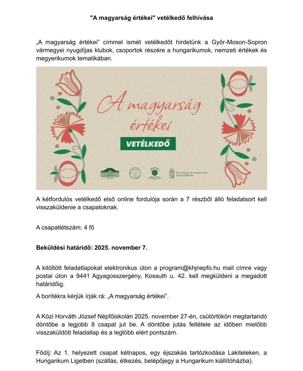 „A magyarság értékei” címmel ismét vetélkedőt hirdetünk a Győr-Moson-Sopron vármegyei nyugdíjas klubok, csoportok részére a hungarikumok, nemzeti értékek és megyerikumok tematikában.