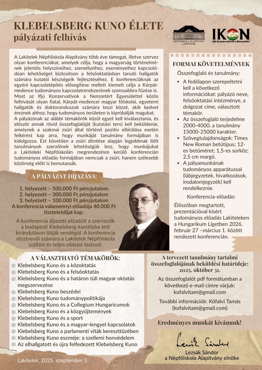 A Lakiteleki Népfőiskola és az IKoN Egyesület közös pályázati felhívásában tizenkét témakörben várjuk Klebelsberg Kunó életének különböző mozzanatait feldolgozó dolgozatok rövid összefoglalóját. A szakmai zsűri pozitív bírálata esetén a pályázó felkérést kap arra, hogy munkáját tanulmány formájában is kidolgozza és a zsűri döntése alapján legjobbnak ítélt tanulmányok szerzőinek lehetőségük lesz, hogy munkájukat a Lakiteleki Népfőiskolán megrendezésre kerülő konferencián bemutassák..