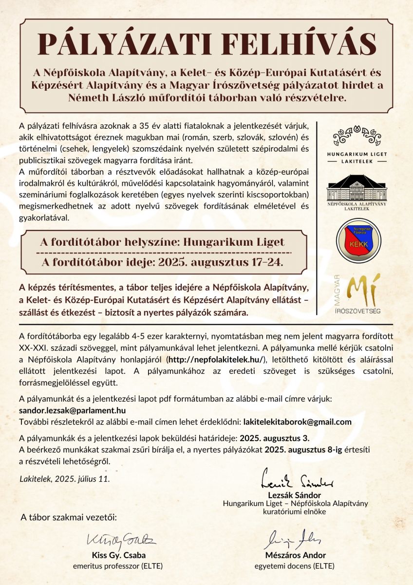 Németh László műfordító tábor 2025. Meghosszabbított jelentkezési határidő