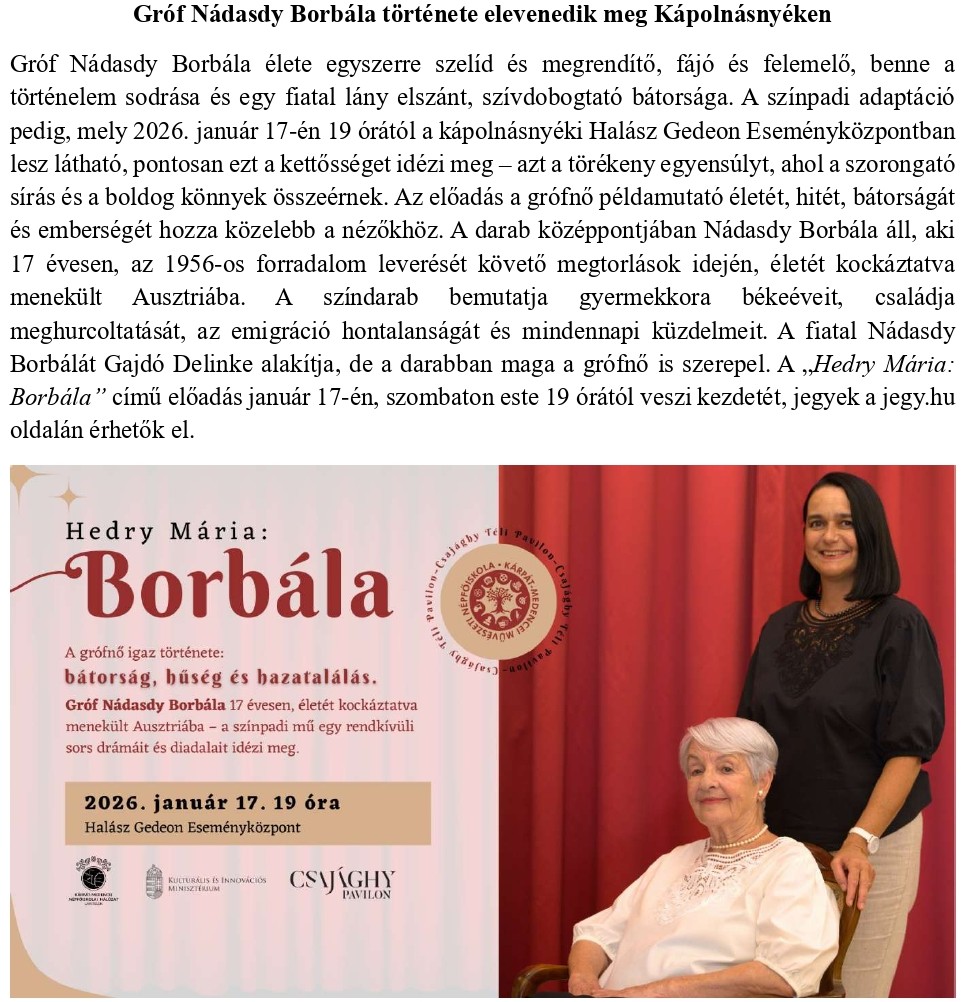 Gróf Nádasdy Borbála története elevenedik meg Kápolnásnyéken