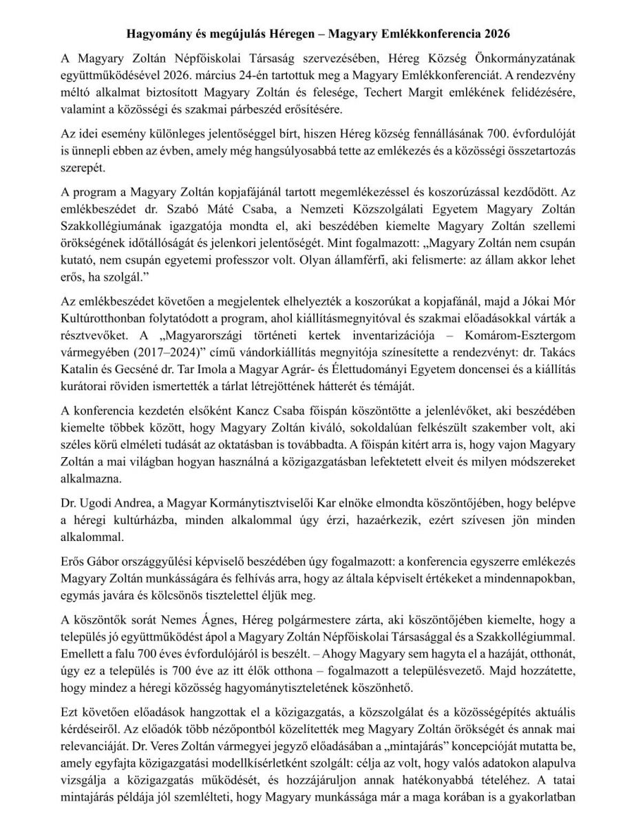 Hagyomány és megújulás Héregen – Magyary Emlékkonferencia 2026