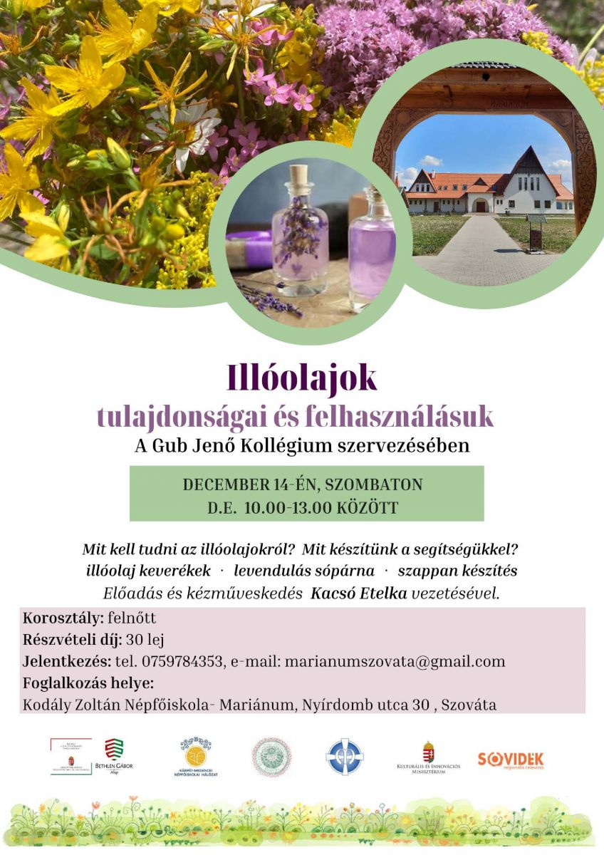 Sok szeretettel várunk minden kedves érdeklődők december 14-én, szombaton délelőtt 10-13 óra között a Gub Jenő Kollégium legújabb alkalmára, melynek a középpontjában az illóolajok állnak. A délelőtt során megismerkedhetnek azzal, hogy hogyan lehet bevezetni az illóolajakat a mindennnapokba és használatuk hogyan segíthet az egészségünk megőrzésében. E karácsonyra hangolódó, illóolajozós kalandunk vezetését Kacsó Etelka illóolaj szaktanácsadó vállalta.