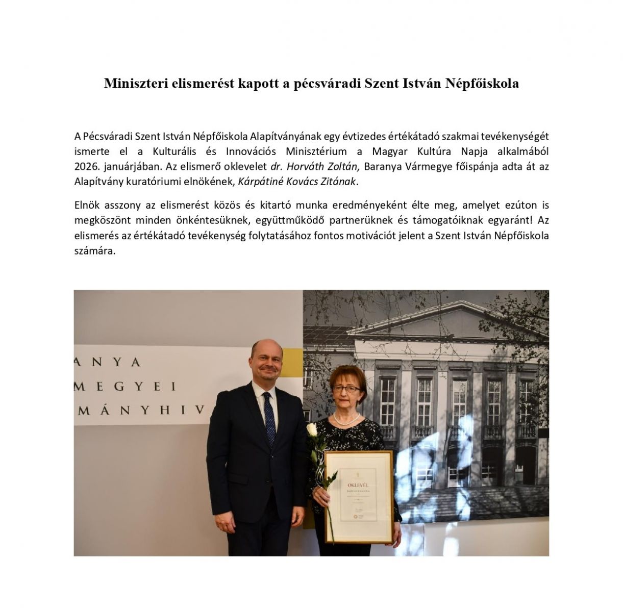 Miniszteri elismerést kapott a pécsváradi Szent István Népfőiskola